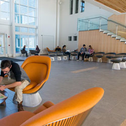 The floor of the lobby is inlaid with fossils from archeological sites in Wyoming’s Green River Formation, which date back a bit further than the Huguenots: about 50 million years. Science Hall is home to offices for the Dean of Science & Engineering, Computer Science, Geology, Physics and Astronomy, Geography, and the AC2 program, which supports students from underrepresented backgrounds pursuing degrees in STEM disciplines at New Paltz.